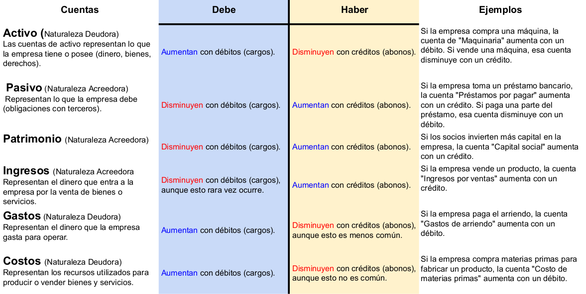 - Acreedora: Aumenta con un crédito (abono) y disminuye con un débito (carga).