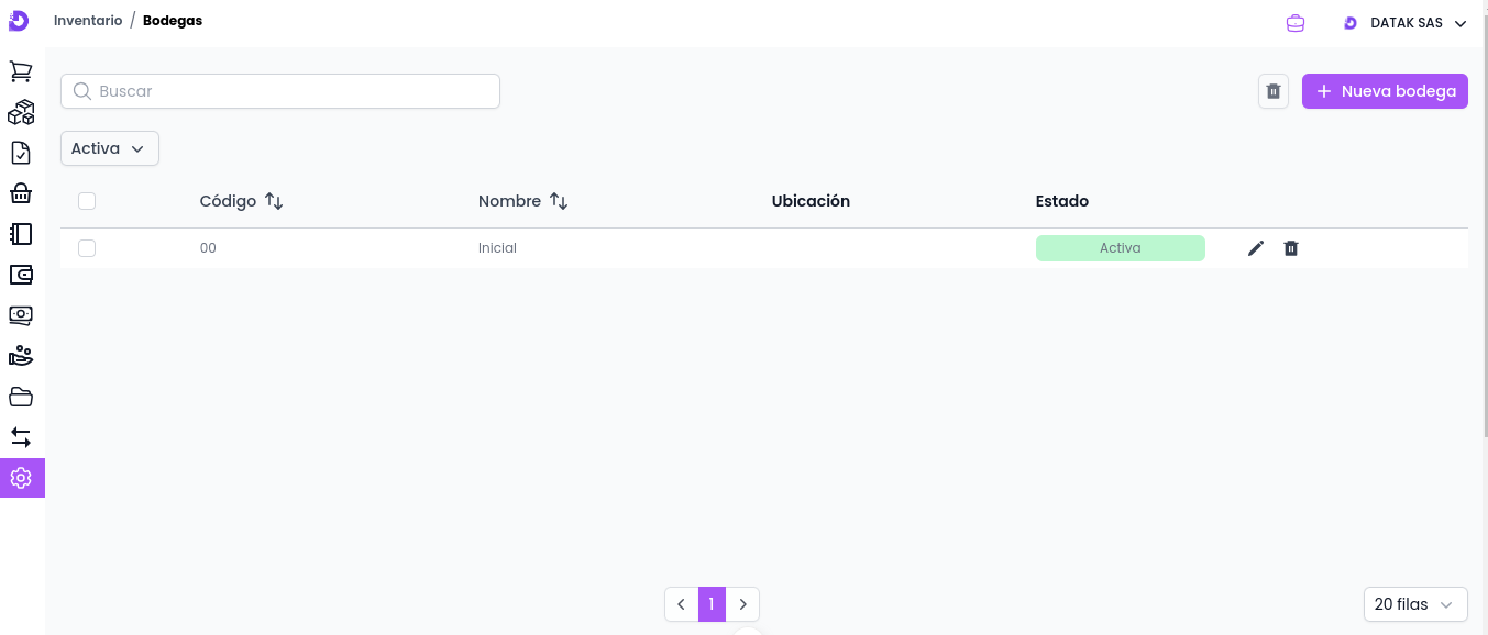 - Estado: Permite activar o inactivar la bodega según su uso.