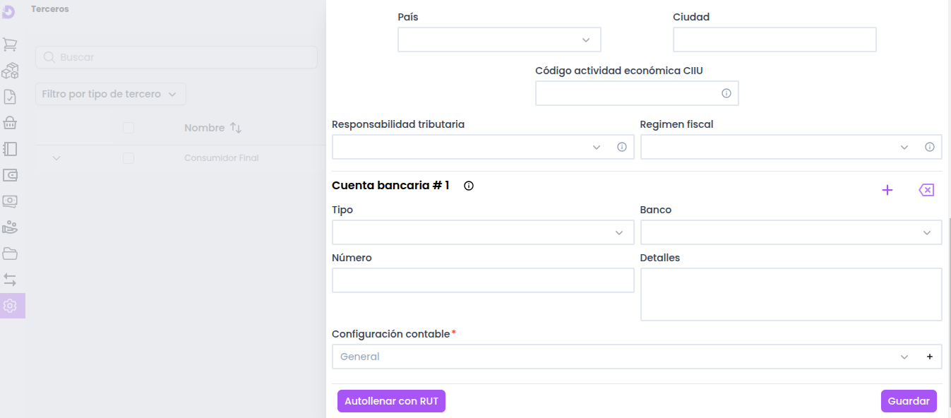 - Cuenta bancaria: Permite registrar las cuentas bancarias de terceros para ser utilizadas en otras funcionalidades. Se debe ingresar el tipo de cuenta, número de cuenta, banco al que pertenece y una breve descripción.